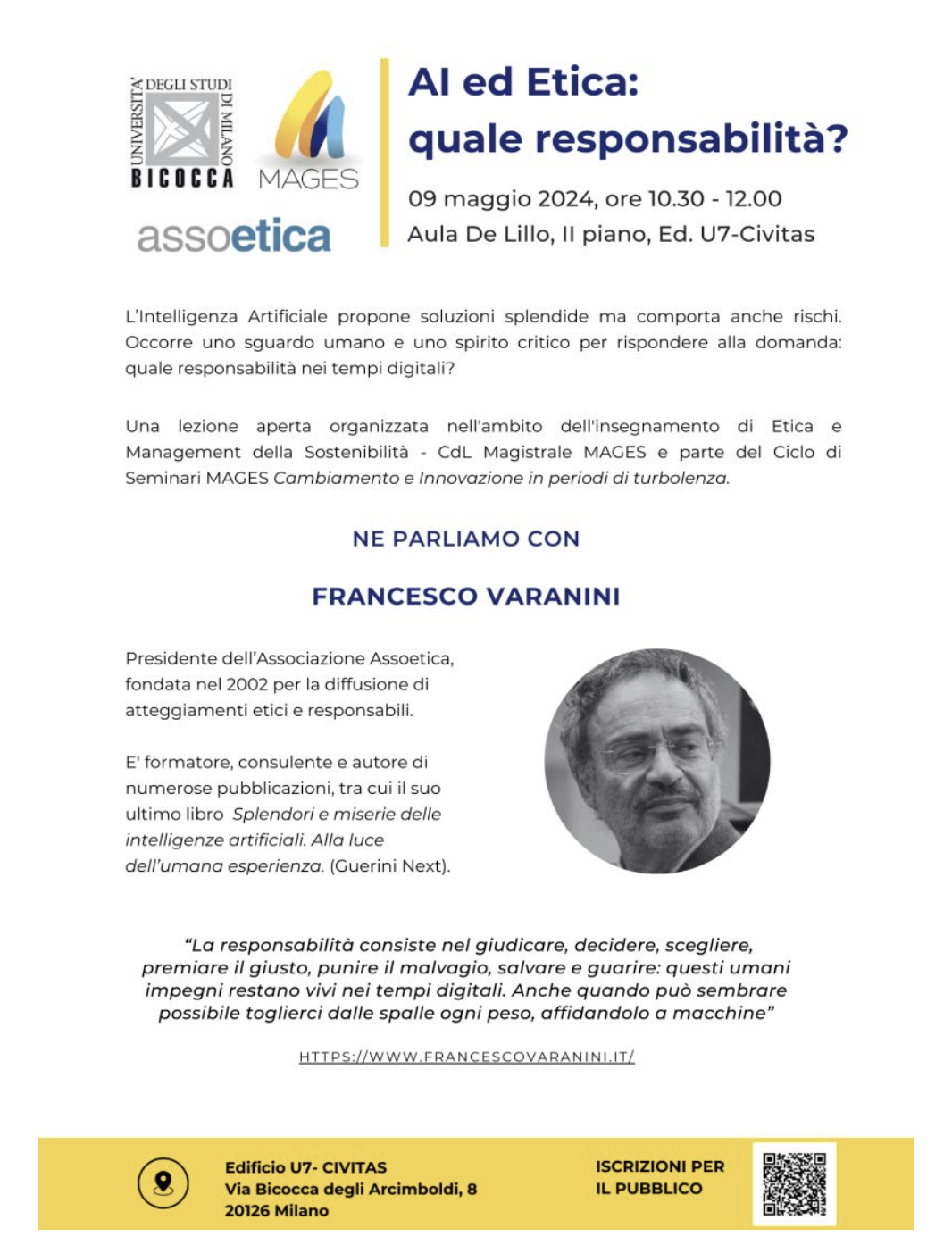 Tratterò, tra l’altro, alcuni argomenti chiave esposti nel mio libro Splendori e miserie delle intelligenze artificiali. Alla luce dell’umana esperienza, in libreria il 24 maggio 2024.