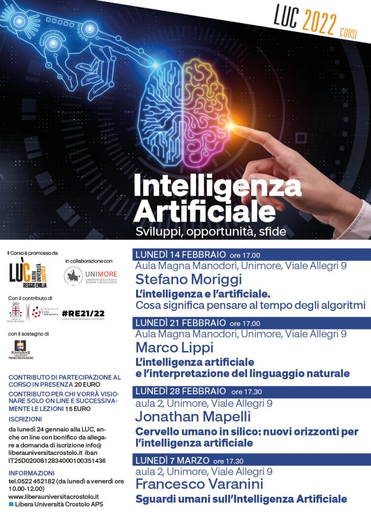 ‘Sguardi umani sull’Intelligenza Artificiale’. Conferenza nell’ambito del ciclo: ‘Intelligenza Artificiale. Sviluppi, opportunità, sfide’, a cura della Libera Università Crostolo e dell’Università di Modena e Reggio Emilia. Lunedì 7 marzo 2022, alle ore 17.30 nell’Aula 2, Viale Allegri 9, Reggio Emilia