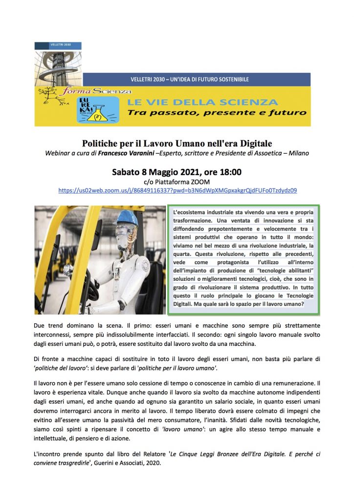 Politiche per il lavoro umano nell’Era Digitale. Sabato 8 Maggio 2021, ore 18. Su piattaforma Zoom, a cura dell’Associazione Velletri 2030