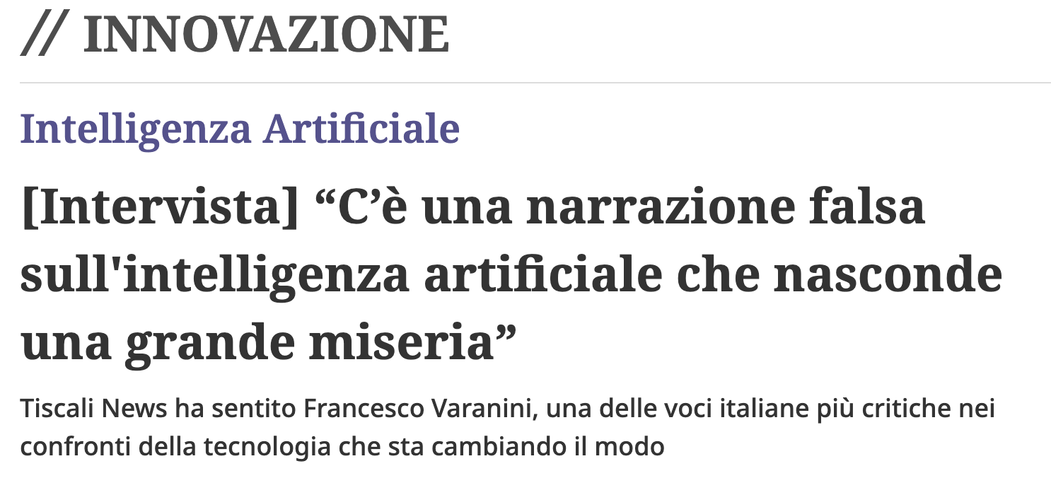 “C’è una narrazione falsa sull’intelligenza artificiale che nasconde una grande miseria” intervista di Michael Pontrelli apparsa su Tiscali news il 26 luglio 2024. A proposito del libro ‘Splendori e miserie delle intelligenze artificiali”
