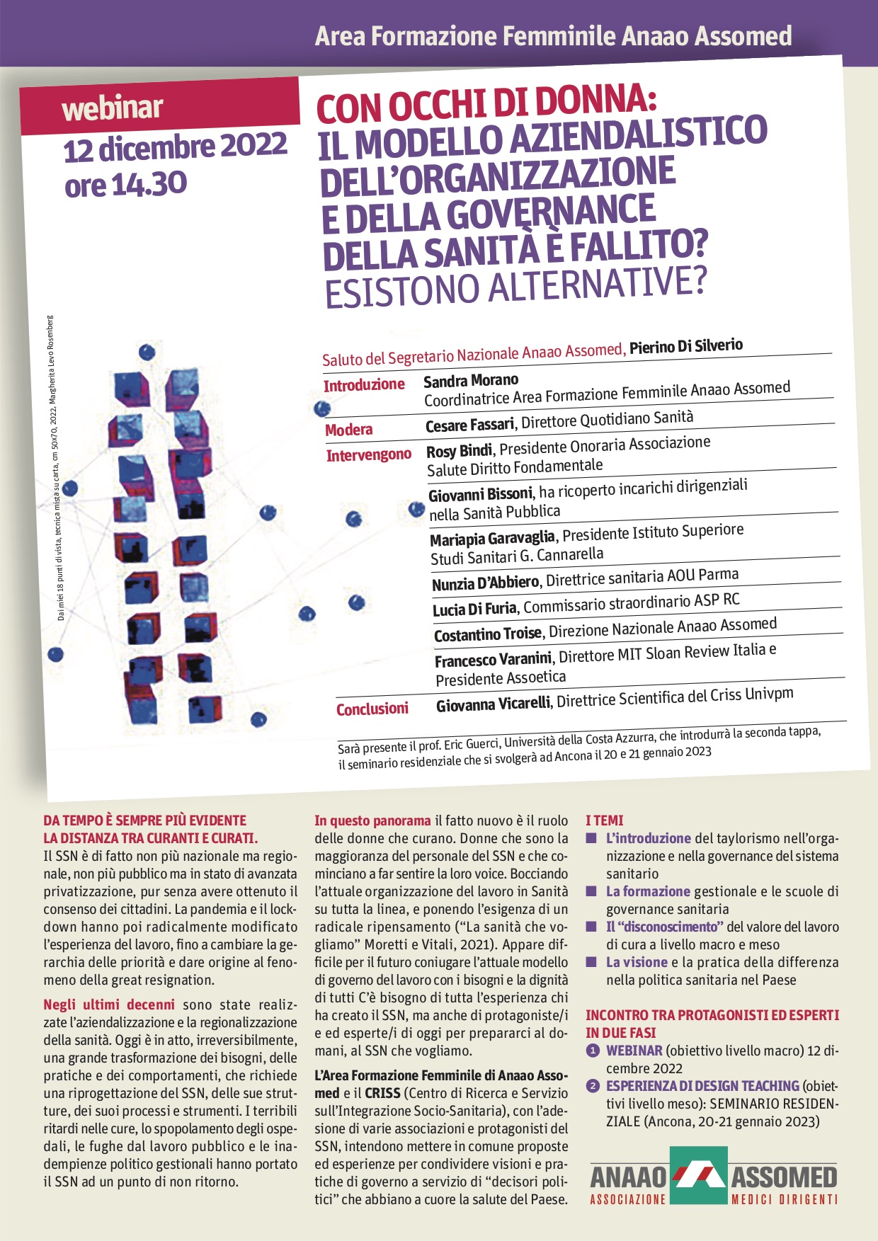 Con occhi di donna: Il modello aziendalistico dell’organizzazione e della Governance della Sanità è fallito? Esistono alternative? Webinar, ore 14.30, 12 dicembre 2022