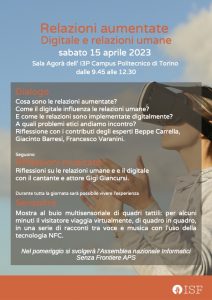A queste e altre domande cercherà di dare risposta il convegno Relazioni aumentate Il digitale e le relazioni umane organizzato da ISF – Informatici Senza Frontiere nell’ambito della sua assemblea annuale, in programma sabato 15 aprile al Campus Politecnico di Torino (Sala Agorà I3P, Corso Castelfidardo 30/a).