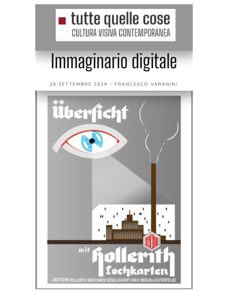 Un esempio efficace è questa immagine. Negli Anni Trenta del secolo scorso, in Germania, nell’anno in cui Hitler saliva al potere, una pagina pubblicitaria della filiale tedesca dell’IBM. L’occhio che guarda dall’alto. Dalla macchina-per-organizzare alla macchina-per-il-controllo-sociale il passo è breve. Il ‘capitalismo della sorveglianza’ non è una novità del Ventunesimo Secolo.