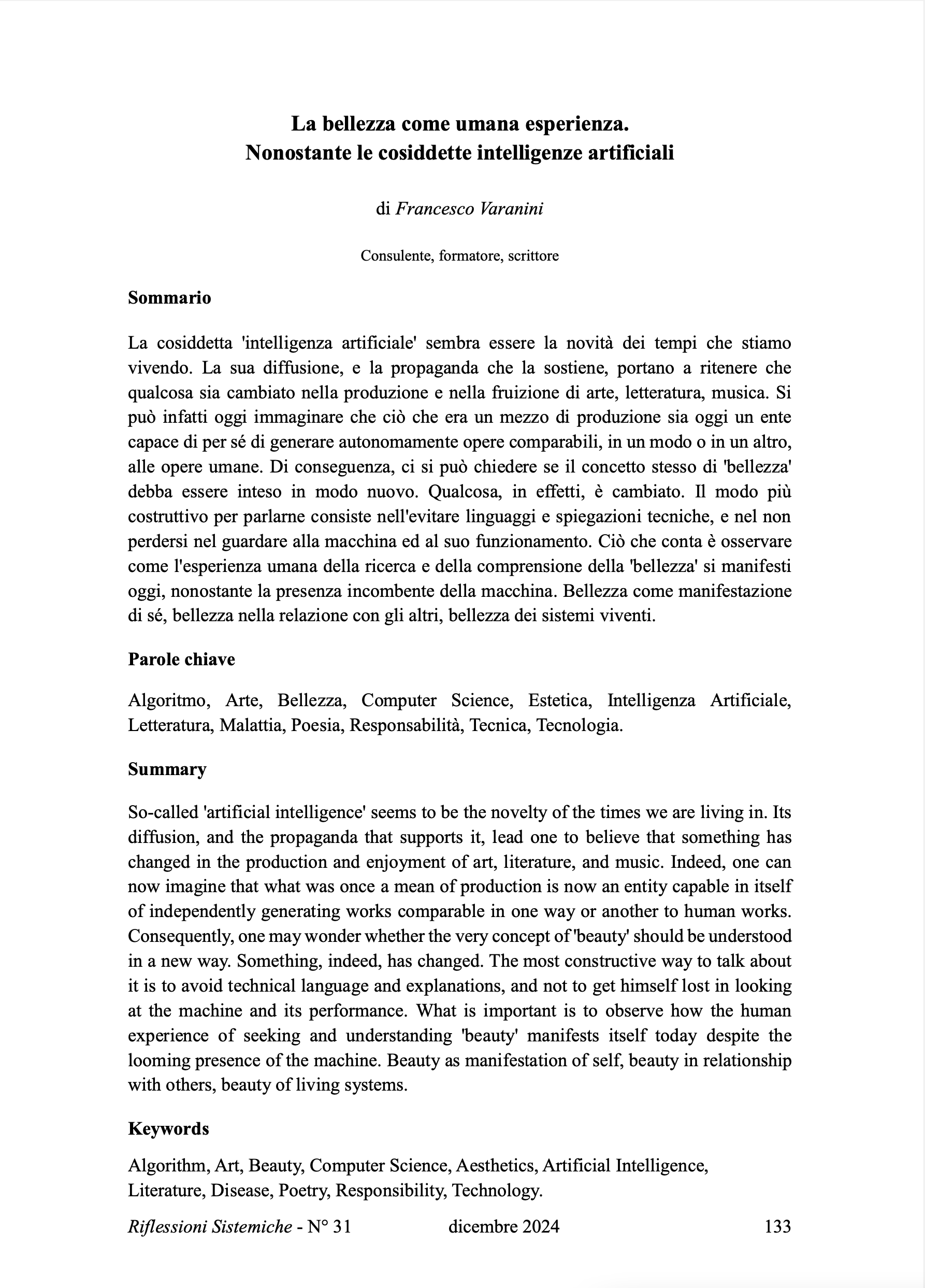 “La bellezza come umana esperienza. Nonostante le cosiddette intelligenze artificiali”, Riflessioni Sistemiche, 31, dicembre.