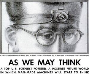 Nel settembre 1945 Vannevar Bush, finissimo tecnologo, ripubblica sulla rivista Life l’articolo As We May Think, uscito su The Atlantic in luglio. Tra le illustrazioni che accompagnano l’articolo, questa, che campeggia sopra il titolo, è la più chiara e significativa.4