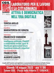 Laboratorio per il lavoro e la cittadinanza attiva nell’Era Digitale. Salone CGIL, piazza della Vittoria 7, Cosenza, giovedì 18 maggio 2023 ore 17