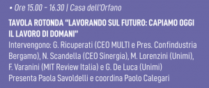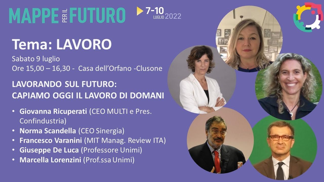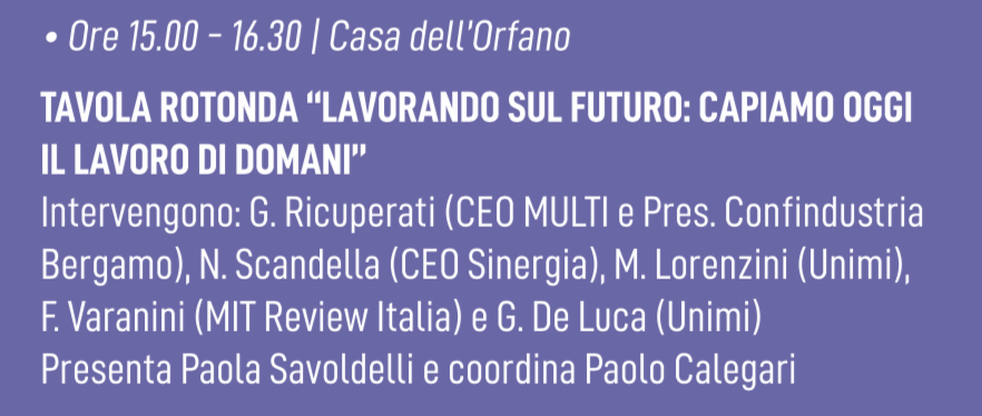 Nell’ambito di Incontriamoci sul Serio: Mappe per il futuro, il sabato 9 luglio 2022, a Clusone (Bergamo), converserò con Giovanna Recuperati, CEO Multi e Presidente Confindustria Bergamo; Norma Scandella, CEO Sinergia; Marcella Lorenzini e Giuseppe De Luca, storici dell’economia, Università di Milano.Parlerò di lavoro umano e di tecnologie digitali.