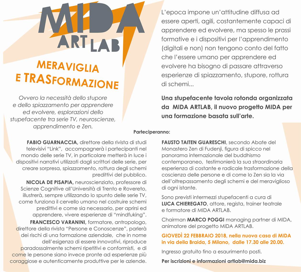 Ho partecipato all’incontro, organizzato da Marco Poggi, managing partner di Mida, insieme a Nicola De Pisapia, neuroscenziato, Università di Trento; Fabio Guarnaccia, Marketing Strategico Mediaset, direttore della rivista di studi televisivi Link, Fausto Taiten Guareschi, secondo abate del Monastero Zen di Fudenji.
