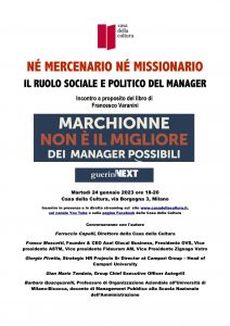 Guarderemo ai temi del libro lasciando la figura di Marchionne sullo sfondo: il manager eroe, salvatore, autorevole e potente, diverso da noi. Allontanandoci da questo stereotipo cercheremo di guardare al ruolo sociale e politico del manager. Non solo un mercenario al servizio dello shareholder, del ‘padrone’ più facile, del potere più pressante ed evidente; ma nemmeno un missionario velleitario, che si illude di salvare il mondo, fingendo di ignorare vincoli e contesti.