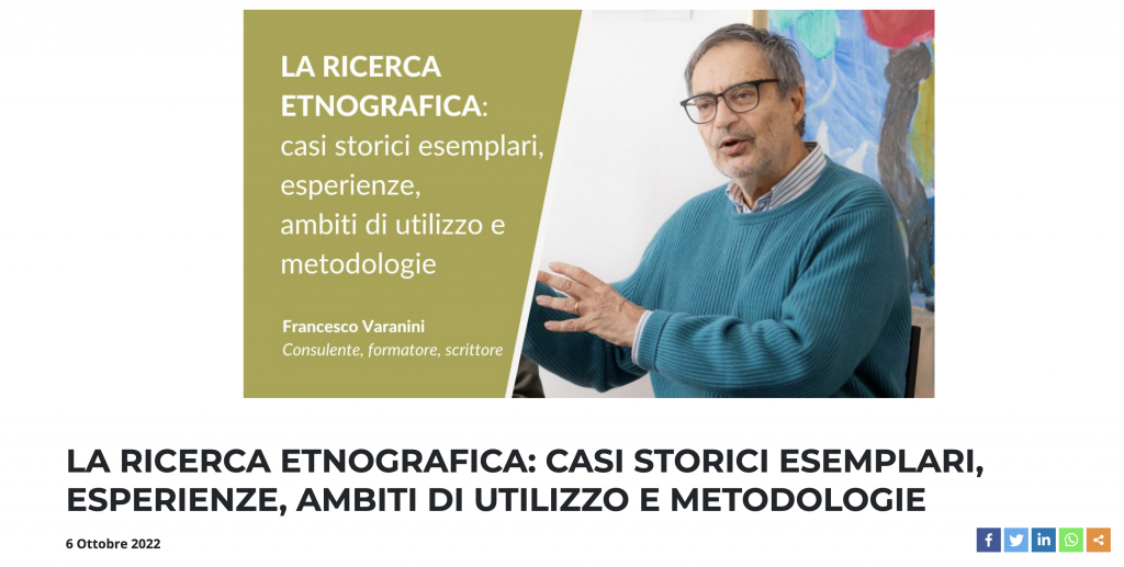 Assirm è l’Associazione nata nel 1991 che riunisce le maggiori aziende italiane che svolgono Ricerche di Mercato, Sondaggi di opinione e Ricerca Sociale. Sulla piattaforma di e-Learning di Assirm propongo il corso La ricerca etnografica. Casi storici esemplari, esperienze, ambiti di utilizzo e metodologie. Otto storie di classiche ricerche etnografiche, accompagnati da riflessioni su […]
