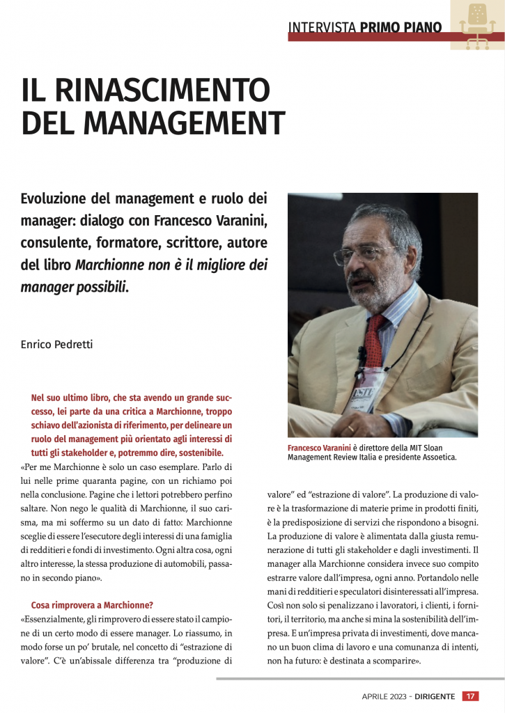 Il rinascimento del management. Intervista a proposito del libro ‘Marchionne non è il migliore…’ su ‘Il Dirigente’, mensile di Manageritalia, aprile 2023