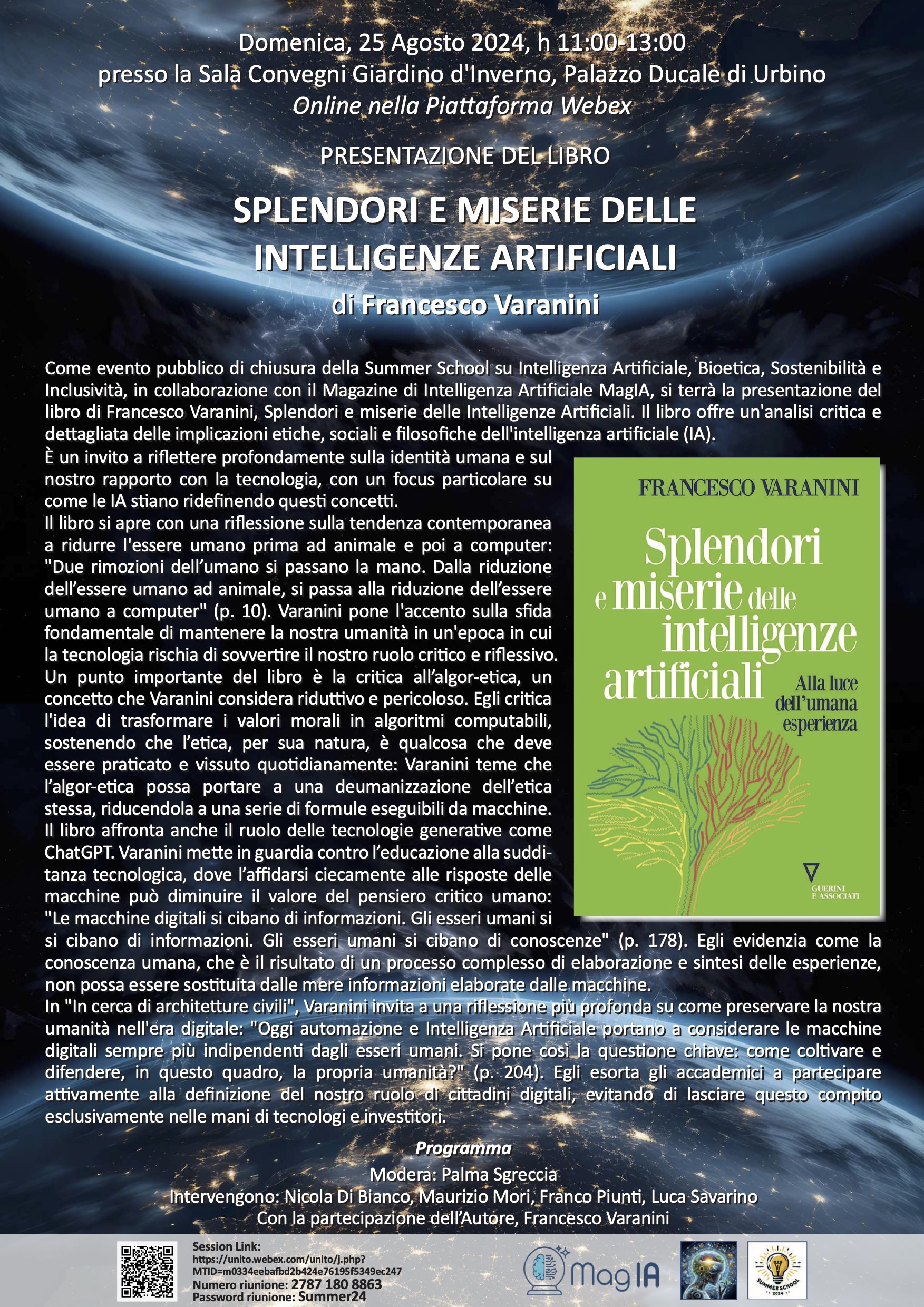 La Summer School inizia lunedì 19 agosto e termina domenica 25 agosto con un Convegno aperto al pubblico e diffuso in streaming, presso la Sala Giardino d’Inverno del Palazzo Ducale. Momento conclusivo del convegno è, alle ore 11, la Presentazione del libro di Francesco Varanini, Splendori e miserie dell’Intelligenza Artificiale, Guerini e Associati, 2024.