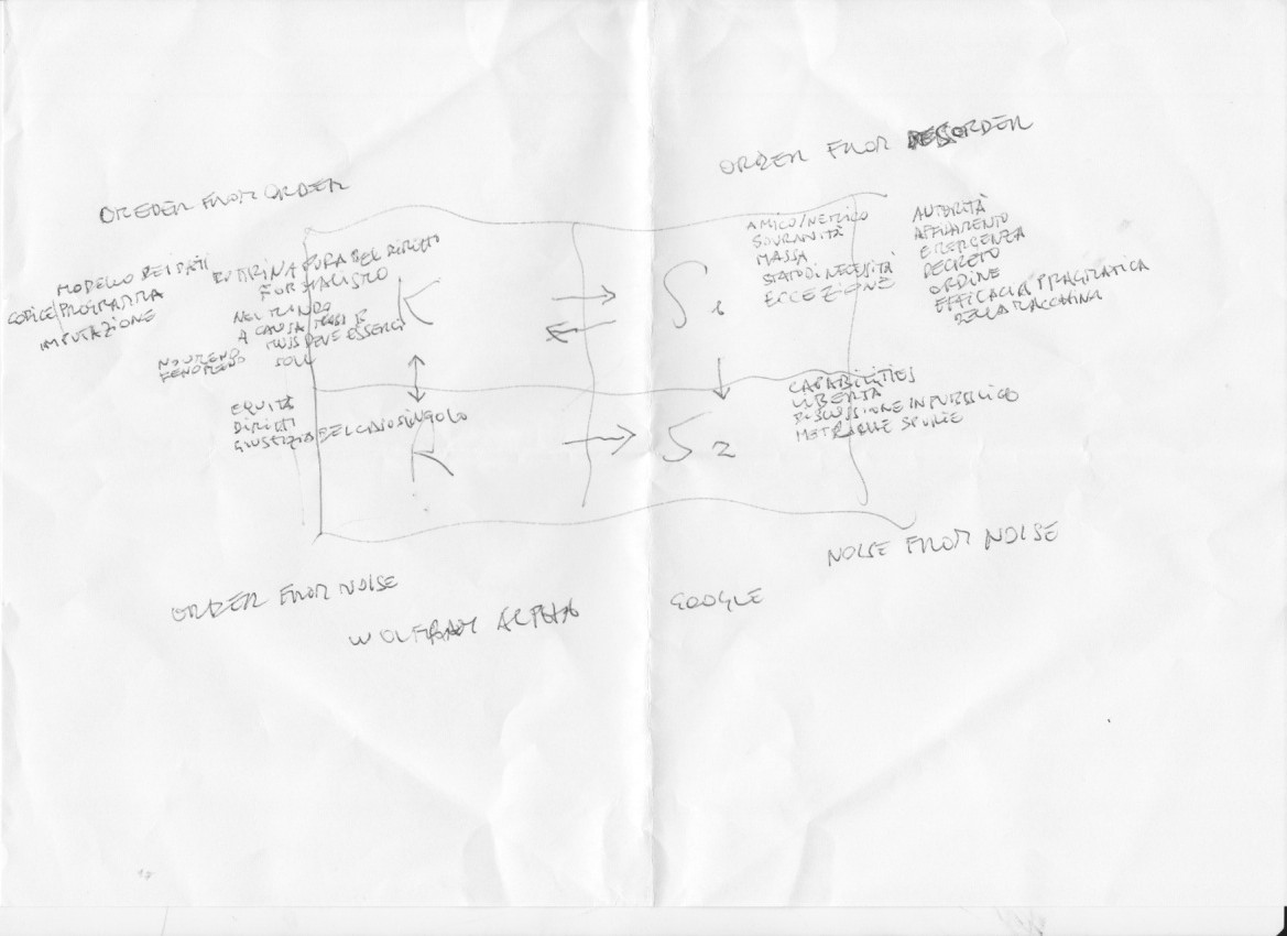 Credo sia meglio intendere una lezione, o un seminario, come esercizio di oralità. Perciò, su un dato argomento, lo stesso autore potrà produrre testi diversi, uno frutto di scrittura, l’altro frutto di oralità, l’altro ancora, magari, frutto di rappresentazione tramite grafi. Tutti questi testi, oggi, potranno essere conservati sotto forma digitale. Non ho un testo scritto di questa lezione (anche se di Kelsen e Schmitt ho scritto in Macchine per pensare). Non sono solito usare presentazioni Power Point. Della lezione ho solo questa traccia, preparata previamente, in parte riprodotta, passo dopo passo, scrivendo sulla lavagna. A lezione svolta, pubblico qui sotto questa pagina, anche per mio promemoria.