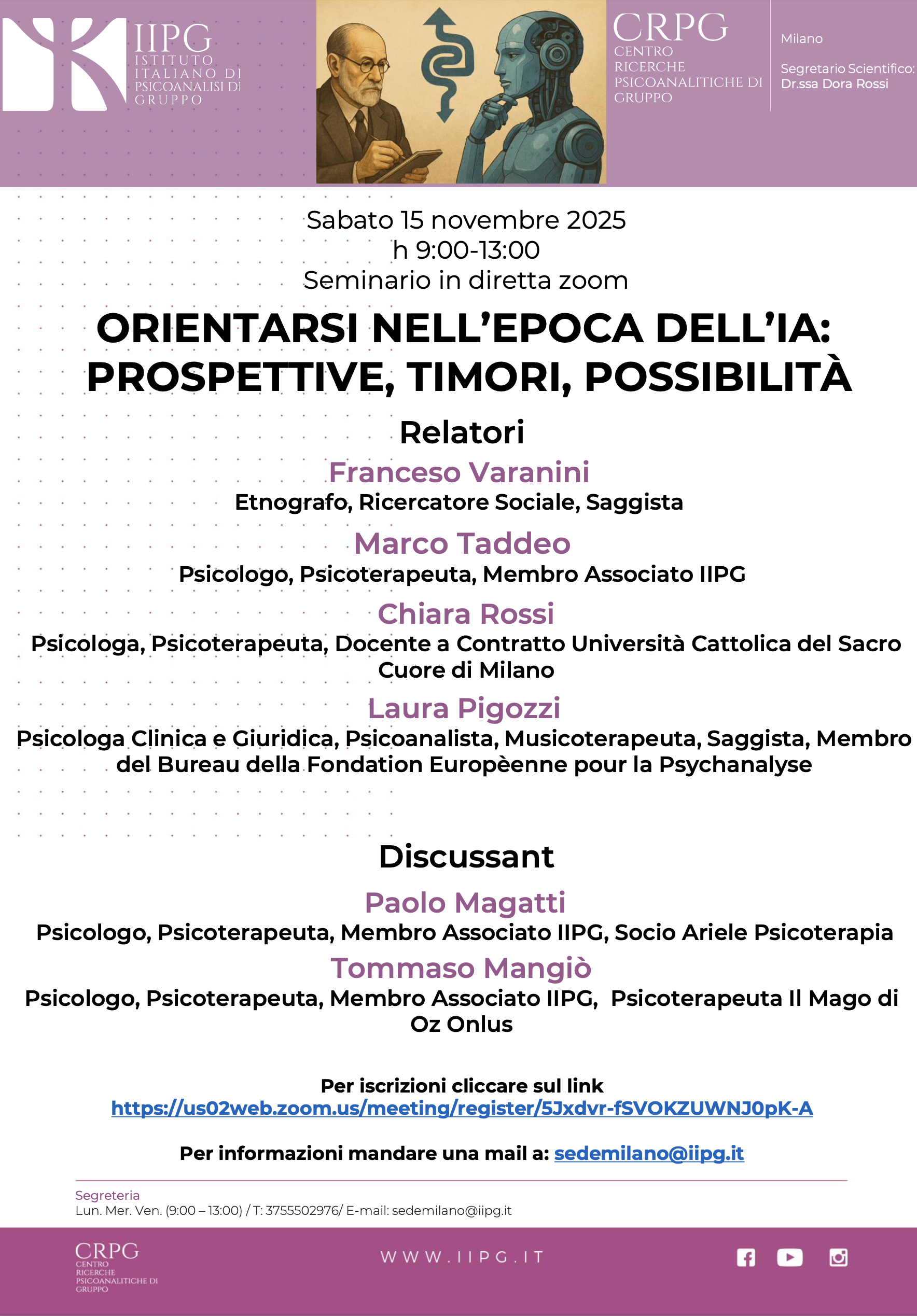 Sabato 15 novembre 2025, ore 9-13, avrà luogo il Seminario Orientarsi nell’era dell’intelligenza artificiale: prospettive, timori, possibilità, organizzato dal Centro Ricerche Psicoanalitiche di Gruppo (CRPG), appartenente all’Istituto Italiano Psicoanalisi di Gruppo. Online su Zoom a questo indirizzo. Partecipazione gratuita.