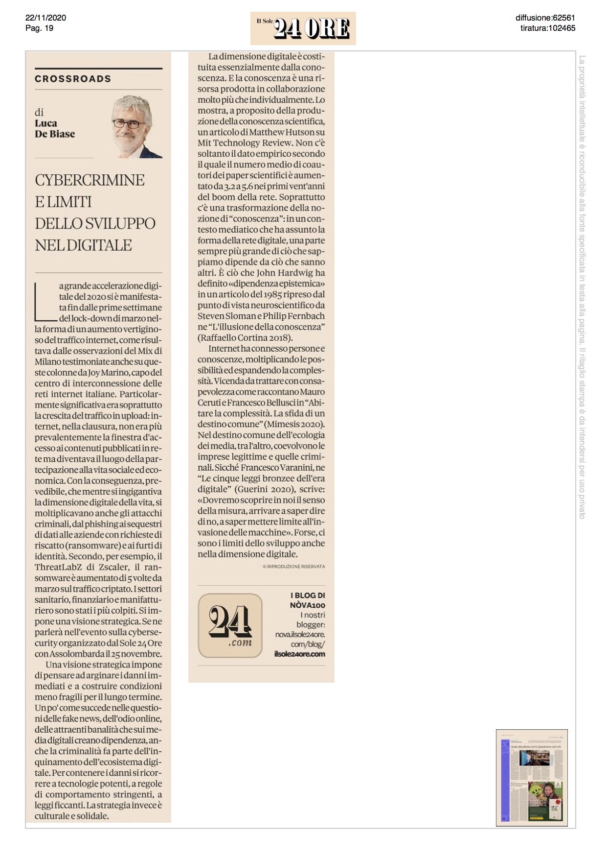 “Internet ha connesso persone e conoscenze, moltiplicando le possibilità ed espandendo la complessità. Vicenda da trattare con consapevolezza come raccontano Mauro Ceruti e Francesco Bellusci in Abitare la complessità. La sfida di un destino comune (Mimesis 2020). Nel destino comune dell’ecologia dei media, tra l’altro, coevolvono le imprese legittime e quelle criminali. Sicché Francesco Varanini, ne Le cinque leggio bronzee dell’era digitale (Guerini 2020) scrive: ‘Dovremo scoprire in noi il senso della misura, arrivare a saper mettere limite all’invasione delle macchine’. Forse, ci sono limiti allo sviluppo anche nella dimensione digitale.”